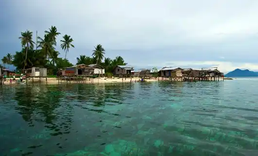 The beach encircles the island and there is a small village of Sea Gypsies (sea Bajau). They survive by fishing and cultivating seaweed. It is possible to buy the purple seaweed there.